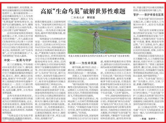 在2024年联合国《生物多样性公约》第十六次缔约方大会(COP16)期间,“‘生命鸟巢’守护三江源头生态和谐”项目作为典型案例入选,向世界展示了推动能源电力绿色转型、促进生物多样性保护的中国方案。