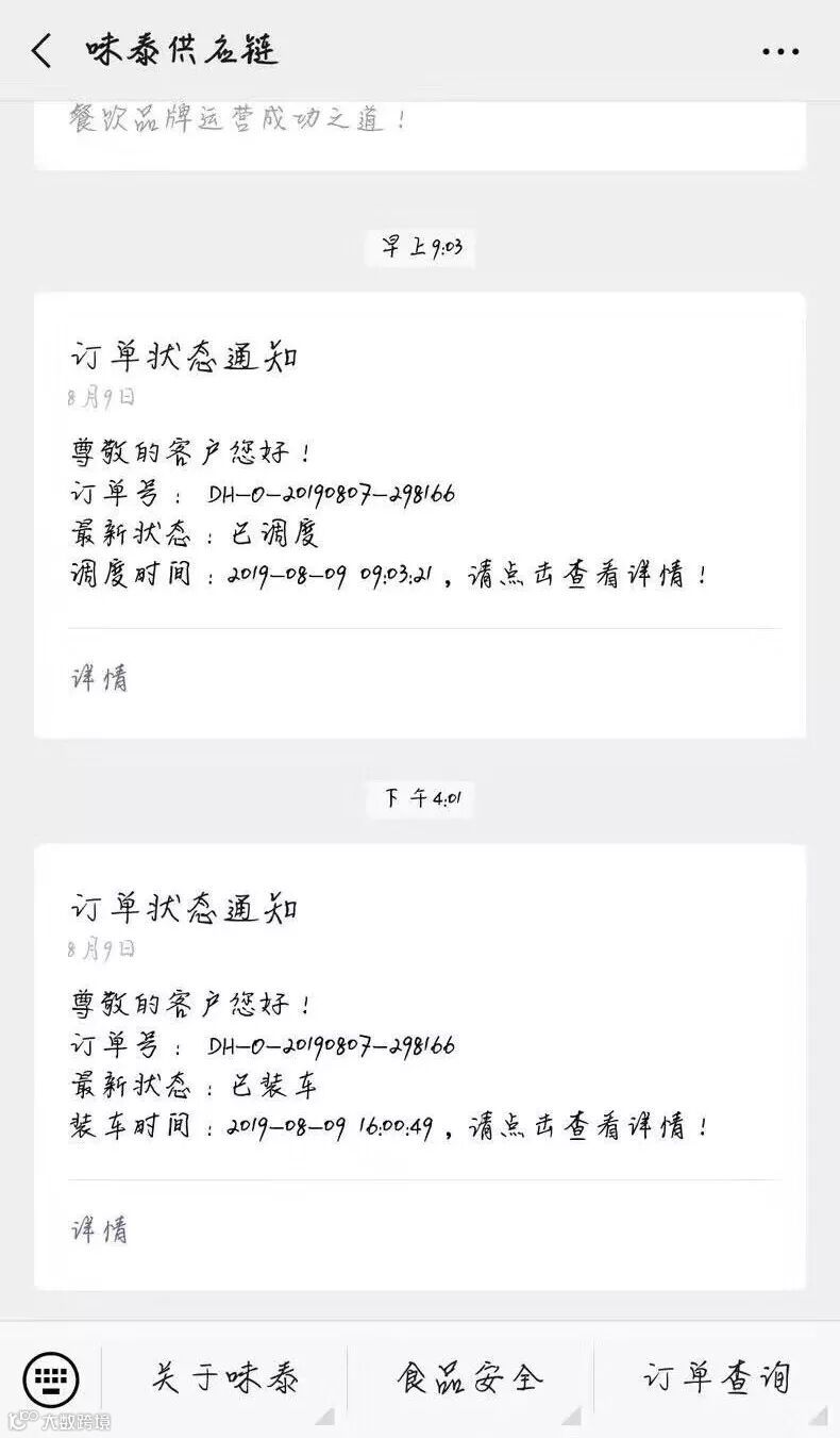 在【味泰供应链】APP下单后,即可在微信公众号上收到订单状态通知