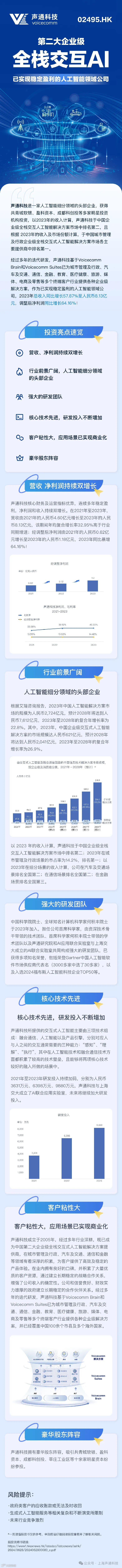 声通科技是一家人工智能细分领域的头部企业,获得共青城软银、盈科资本、成都科创投等多家明星投资机构投资,以2023年的收入计算,声通科技于中国企业级全栈交互人工智能解决方案市场中排名第二,且根据2023年的收入及市场份额计算,于中国城市管理及行政企业级全栈交互式人工智能解决方案市场各主要提供商中排名第一。经过多年的迭代研发,声通科技基于Voicecomm Brain和Voicecomm Suites已为城市管理及行政、汽车及交通、通信、金融、教育、医疗健康、旅游、媒体、电商及零售等多个终端客户行业提供各种企业级解决方案,作为已实现稳定盈利的人工智能领域公司,2023年总收入同比增长57.87%至人民币8.13亿元,调整后净利润同比增长64.16%!