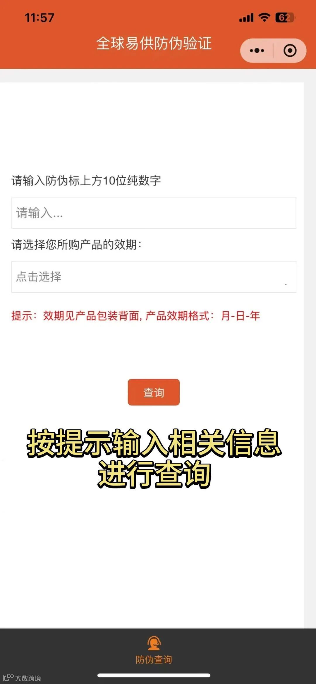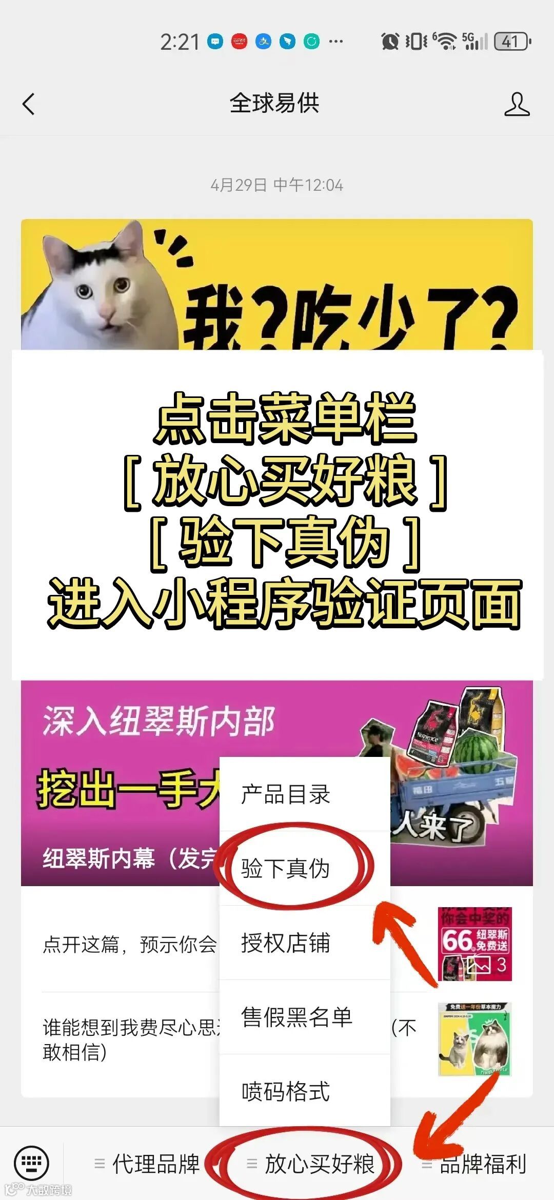 点击【全球易供】公众号菜单栏-【放心买好粮】-【验下真伪】,进入【全球易供gse官方】小程序,点击【扫码】扫描包装上的防伪码,按提示输入信息进行验证。
