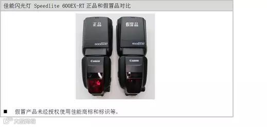 经确认,假冒产品并未搭载佳能正品闪光灯Speedlite 600EX-RT的无线电传输无线拍照功能。此外,这些假冒产品不符合佳能的安全标准,所以在使用这些假冒产品的过程中很有可能会出现着火或冒烟等损害消费者权益的情况。我们提醒您注意,由于使用假冒产品而发生的故障、事故或损坏,佳能公司恕不承担责任,请您在选购时特别留意。