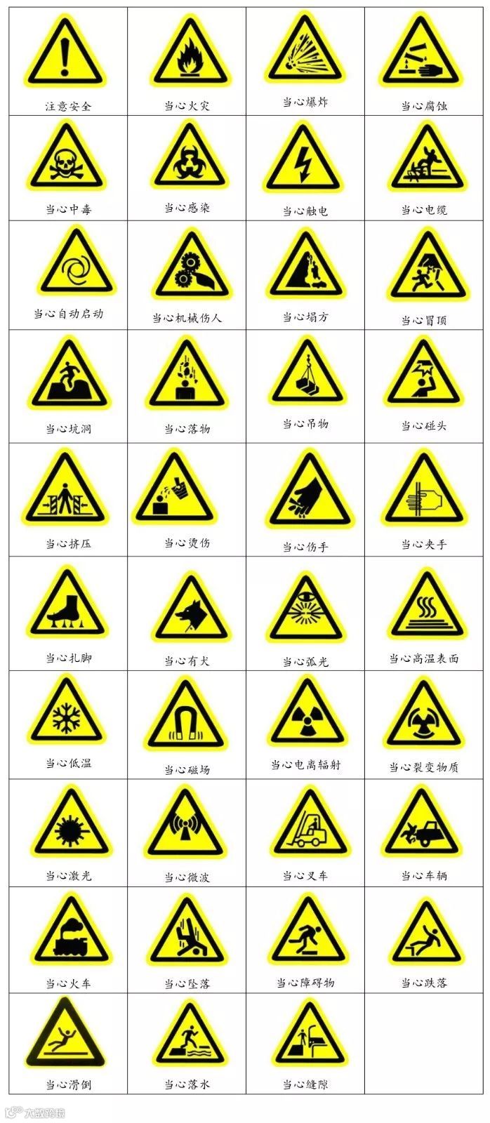 警告标志是提醒人们对周围环境引起注意,以避免可能发生危险的图形标志。警告标志的几何图形是黑色的正三角形、黑色符号和黄色背景。