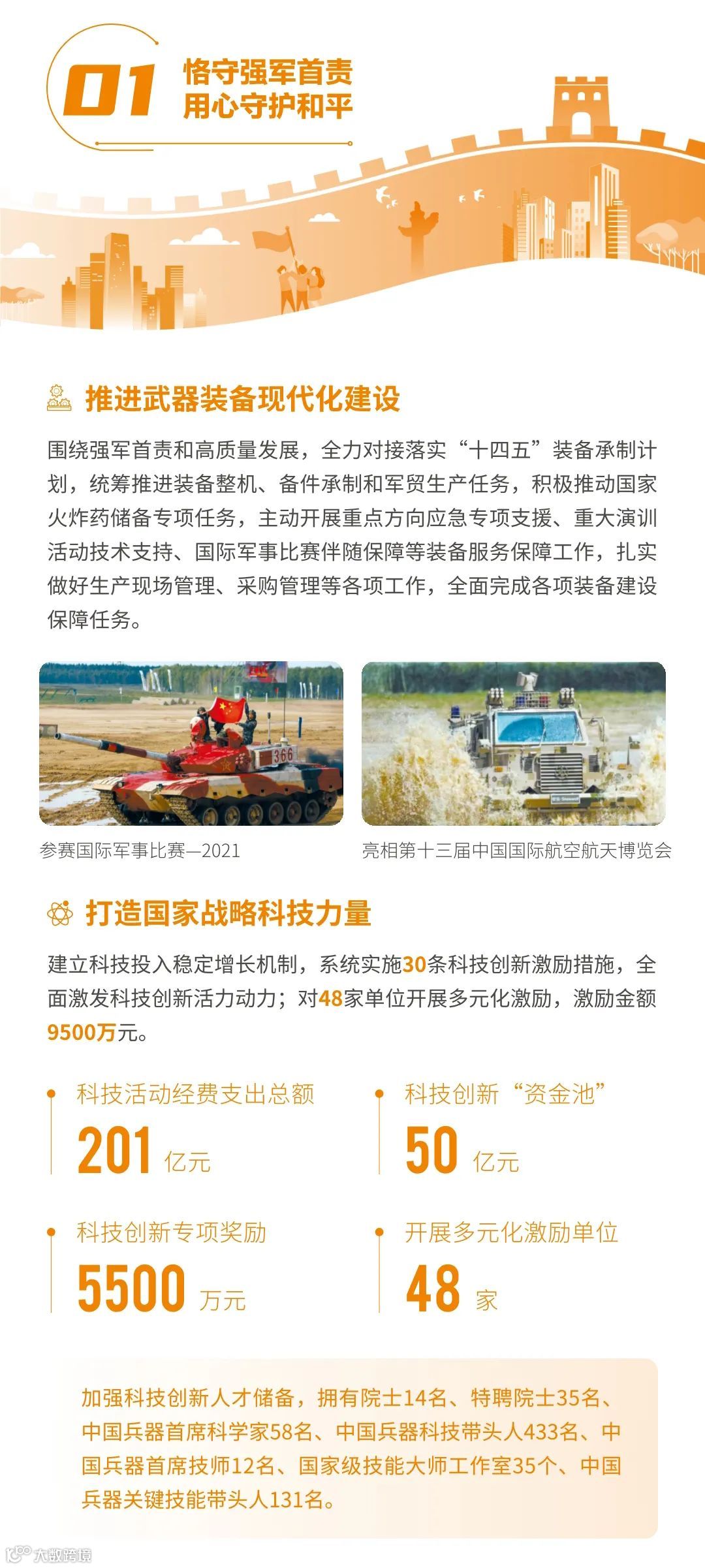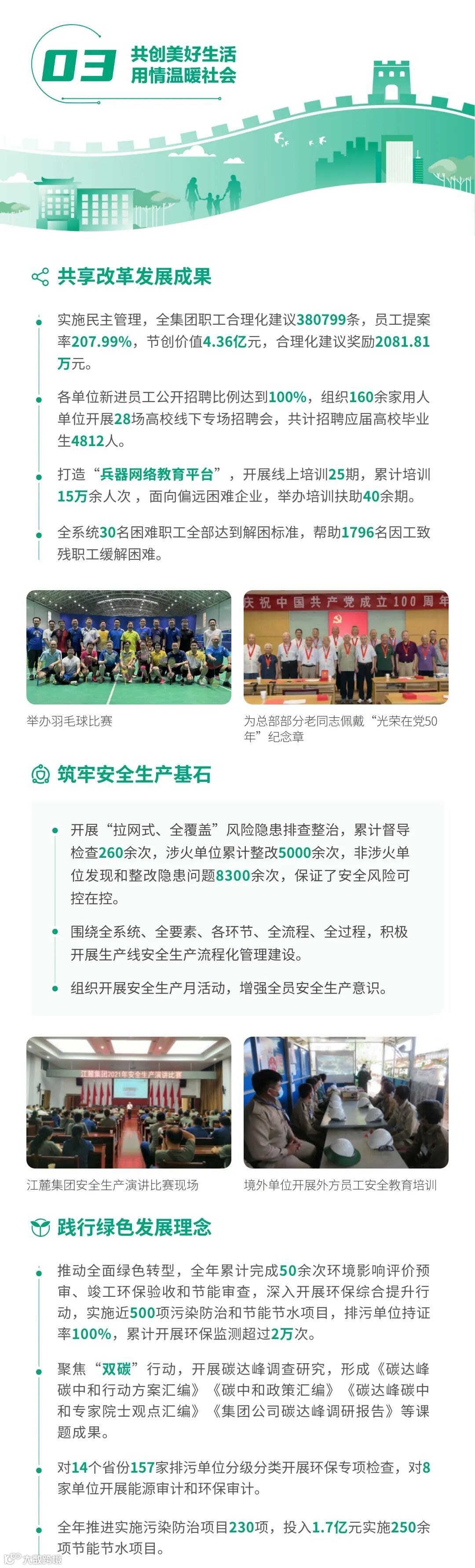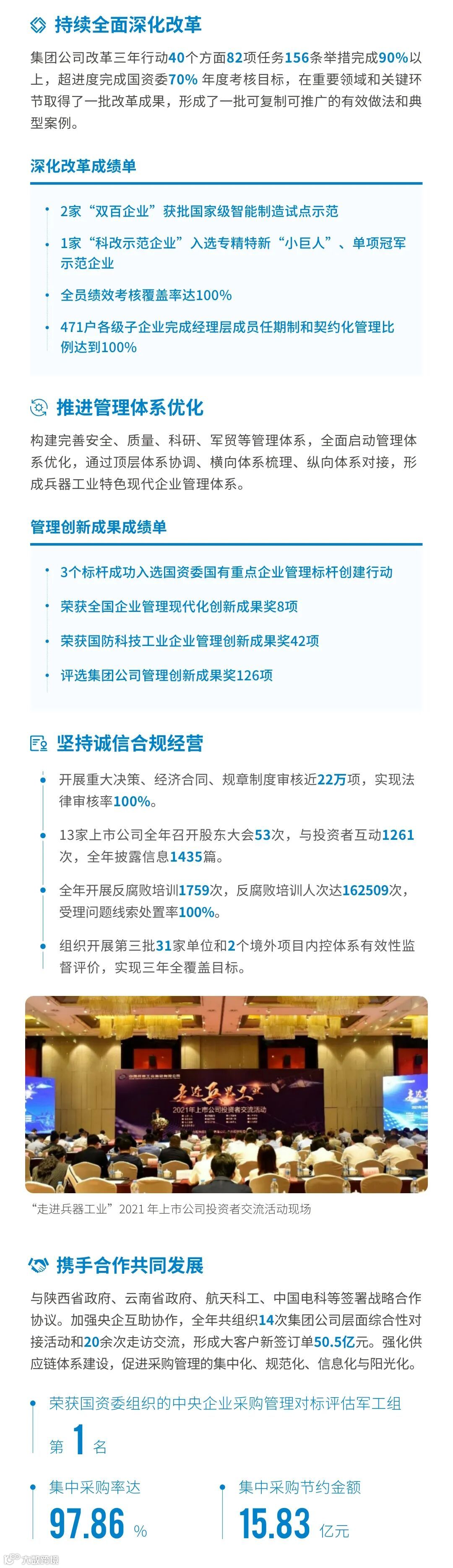 近日,兵器工业集团正式发布第十三份年度社会责任报告——《中国兵器工业集团有限公司2021年社会责任报告》,以“用心守护和平、用力争创一流、用情温暖社会”为主题,从恪守强军首责、服务经济建设、共创美好生活三个维度,向社会全面披露2021年度履责实践和履责业绩。《报告》连续第三年获得中国企业社会责任报告评级专家委员会“五星佳”评级,兵器工业集团成为军工行业唯一连续11年获得五星及五星佳最高评级的企业。