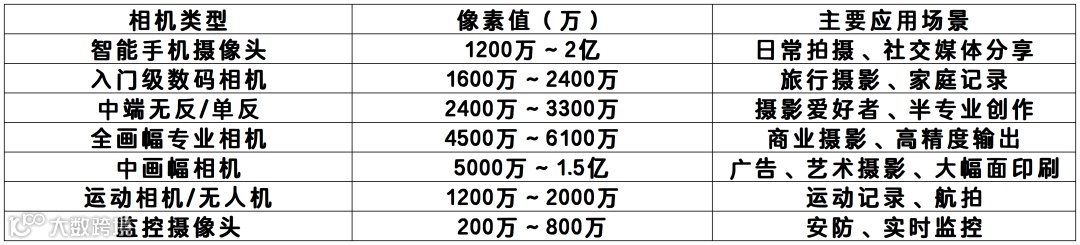 (图为常见的相机类型以及它们的像素值)