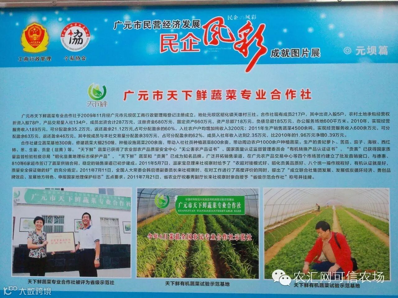 该合作社地处广元市昭化区昭化镇,充分利用三江之水、土壤肥沃、交通便捷等独特优势和蔬菜种植传统,联盟全国高科技农业循环产业发展中心,联手打造蔬菜生产示范基地。合作社成立以来,始终坚持“建一个合作社、带一片基地、兴一项产业、活一方经济、富一方百姓”的宗旨,秉承“感恩之心、创业之志、诚信之本、奋进之势”的理念,采取连龙头、接市场、带农户模式,实行生产技术、操作规程、配种育苗、农资供应、质量检测、包装标识、品牌宣传、加工销售“八统一”,打造标准化规模基地,发展无公害绿色有机特色蔬菜产业。历史上传统皇家贡品——昭化韭黄为领军龙头的天下鲜蔬菜系列产品被认定为国家“无公害农产品”、获得“有机转换产品认证”,其中主打产品昭化韭黄成为国家地理标志保护产品。昭化贡黄、贵妃萝卜为拳头产品的“天下鲜”系列蔬菜成为知名品牌,在巩固扩大广元市城区市场的同时,成功挺进北京、成都、西安等大城市,更成为中国四川(彭州)蔬菜博览会、四川暨大巴山优质农产品绿色展销(北京)周活动买家青睐的热销产品。