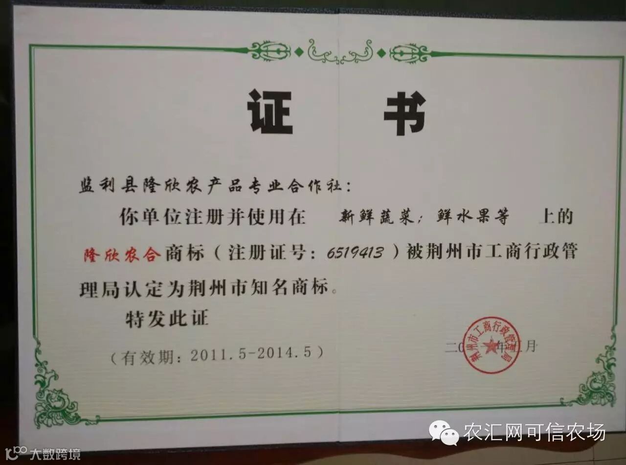 目前,已成为监利县现代农业建设的先进合作社、荆州市示范合作社、湖北省示范合作社、农业部首批农民专业合作社示范社;湖北省供销系统“十佳专业合作社”、中华全国供销总社“千社千品富民工程”企业之一、获得“家乐福”授予的“特别贡献奖”殊荣、是荆州市“重合同守信用”单位。“隆欣农合”商标取得荆州市知名商标和2012年中国合作社经济成就奖——具有影响力的品牌。