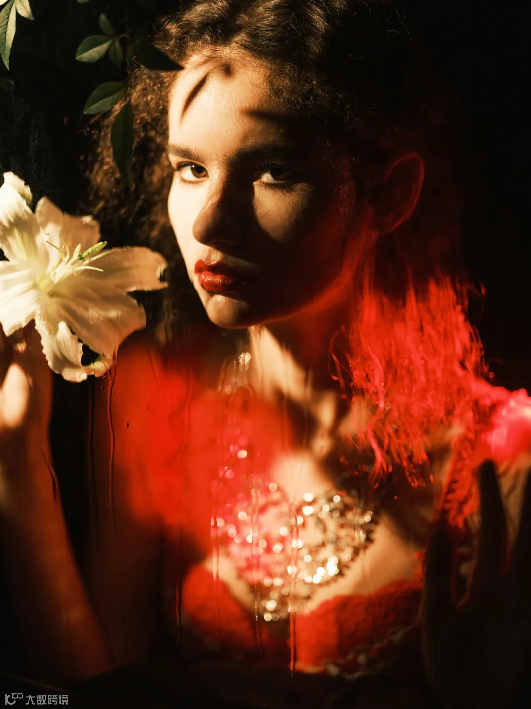 这幅作品中,我使用了两盏灯来拍摄,在人物的右侧,我使用了一盏灯加上一个四叶挡板拍摄出这样的光影,这个光比是比较大的,所以人物的影子比较明显。另一盏灯在人物的另外一侧,我使用了一个红色的LED灯加上了红色的滤色片,去更改灯光的色温,最后营造出一个非常有冲突感和戏剧张力的作品。