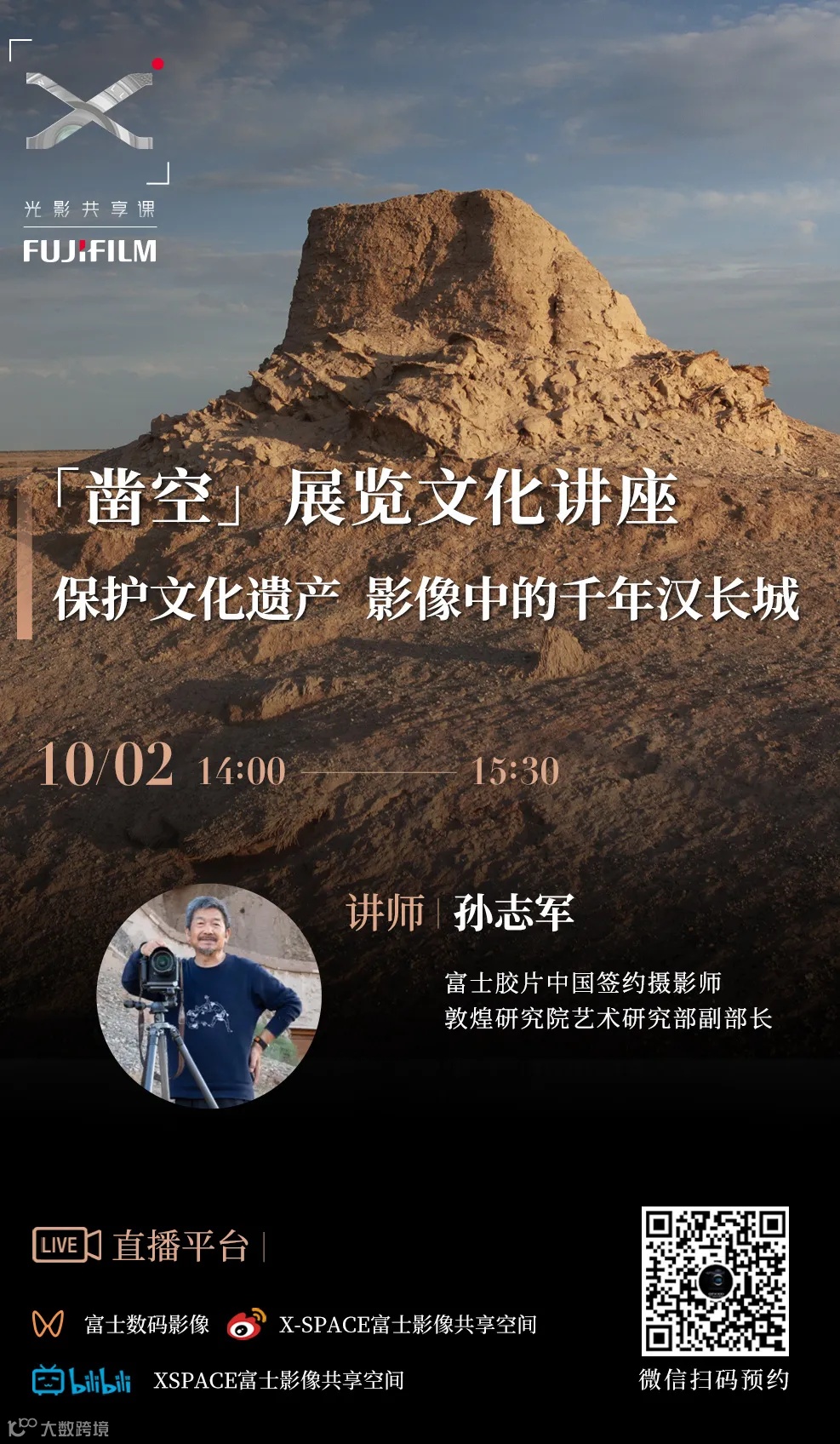 十一长假即将开启,让我们跟随摄影师孙志军的镜头,探索“凿空”展览的深邃内涵。这场讲座将呈现孙志军老师多年来对汉长城的深入拍摄与思考的精华结晶。透过富士胶片无反相机的独特视角,我们将一同领略古老长城如何穿越时空,在光影交错中诉说着历史的沧桑与人文的壮美。