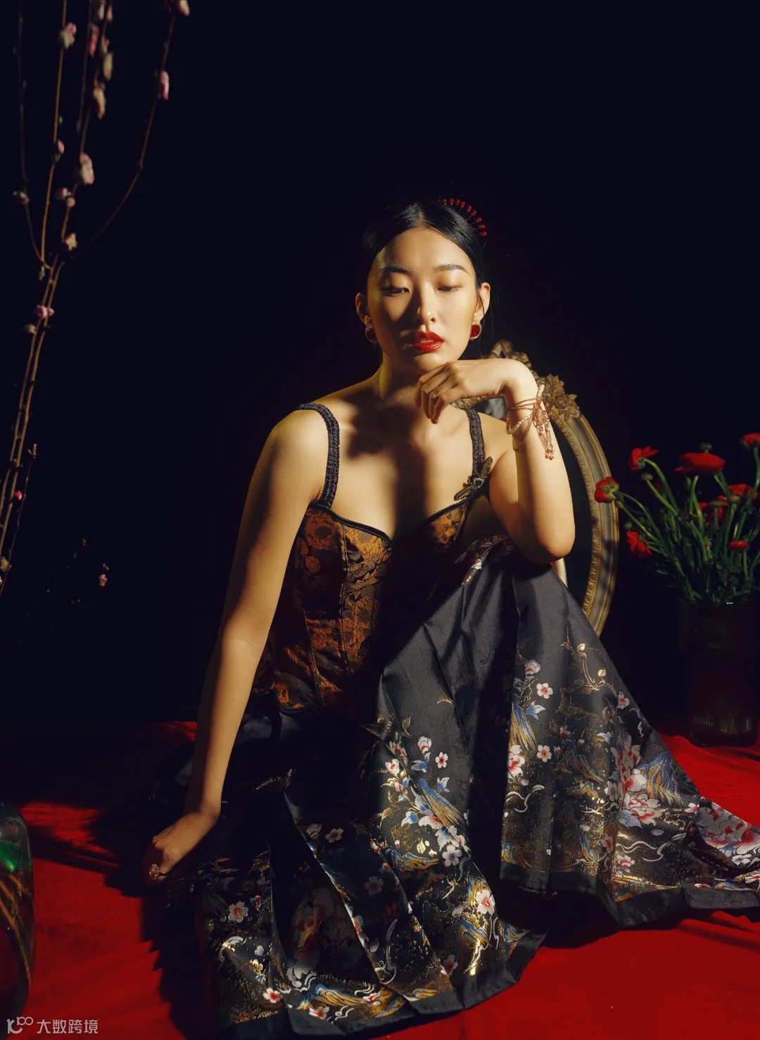 所以我为这位女生拍摄了这组作品,我不会1:1复刻电影,而是会结合我的想法来拍摄。我结合了一些特别的道具,比如我选择了梅花,这会让人联想到一些东方的元素。在服装上,我选择中西结合的方式,模特穿的是马面裙,搭配有一点带欧式复古的胸衣,拍摄出来非常有新中式感觉。我全程使用一盏灯来拍摄,把灯放在人物的侧前方,打出了一个伦勃朗光,利用这样的光影去突出光怪陆离的世界。我使用的拍摄机器是GFX100II,它记录下了暗光环境下的细腻瞬间。这幅作品我使用了NN胶片模拟,我觉得NN胶片模拟很适合带一点复古的、中世纪油画的感觉。