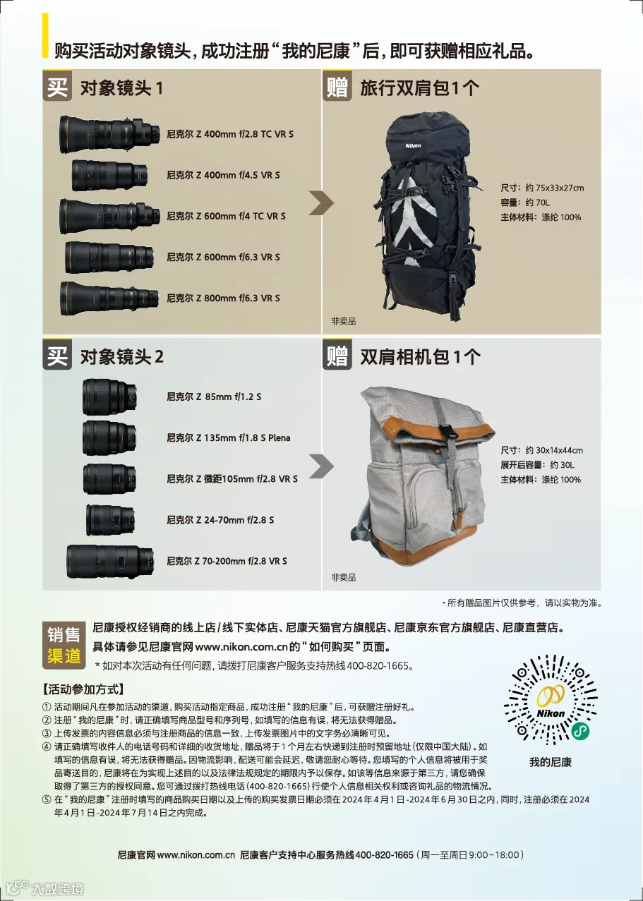 活动期间,凡购买尼克尔 Z 400mm f/4.5 VR S、尼克尔 Z 24-70mm f/2.8 S等十款尼克尔镜头,并成功完成【我的尼康】注册的用户,即可获赠尼康好礼一份。