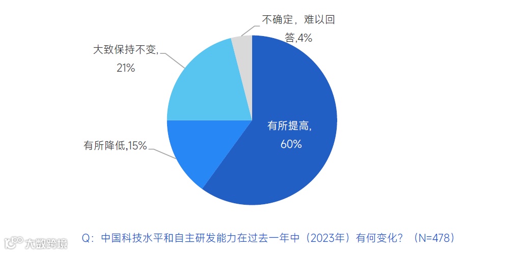 2023年,美国收紧对华芯片等高科技产品出口限制。对于过去一年中国的科技水平和自主研发能力,60%的企业管理者认为“有所提高”,21%认为保持不变,一成多认为“有所降低”。