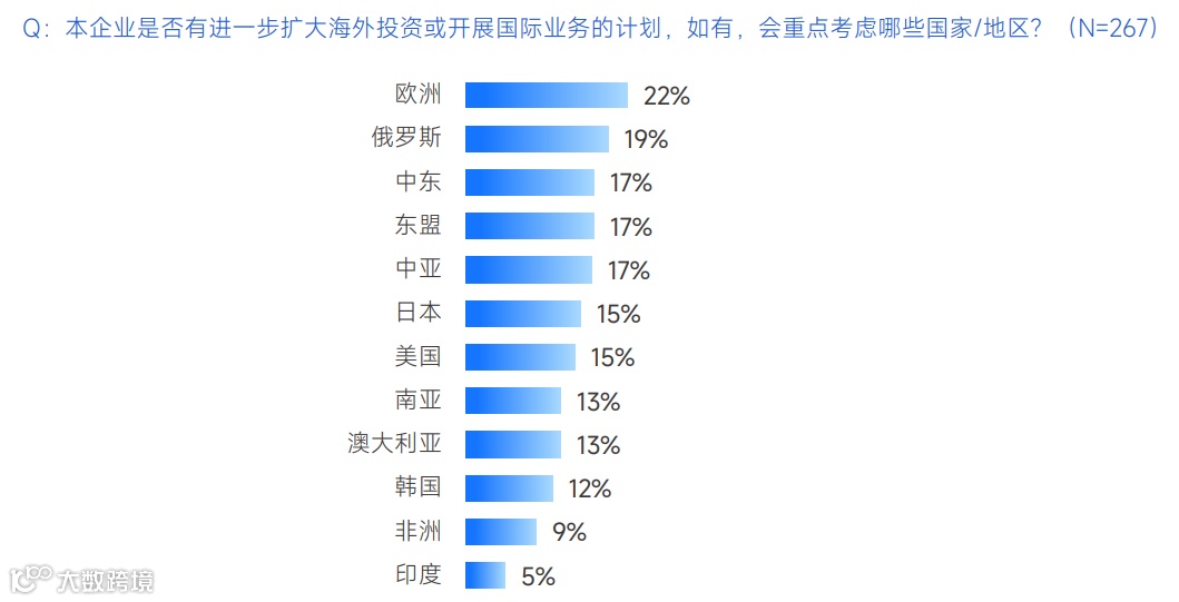 针对267位中资企业管理者进一步询问其企业未来的海外投资和国际业务拓展计划,近三成受访者表示没有相关计划。对于有海外投资计划的中企管理者,欧洲是他们最青睐的投资地,选择率为22%;俄罗斯排第二,占比19%;中东、东盟、中亚并列第三。