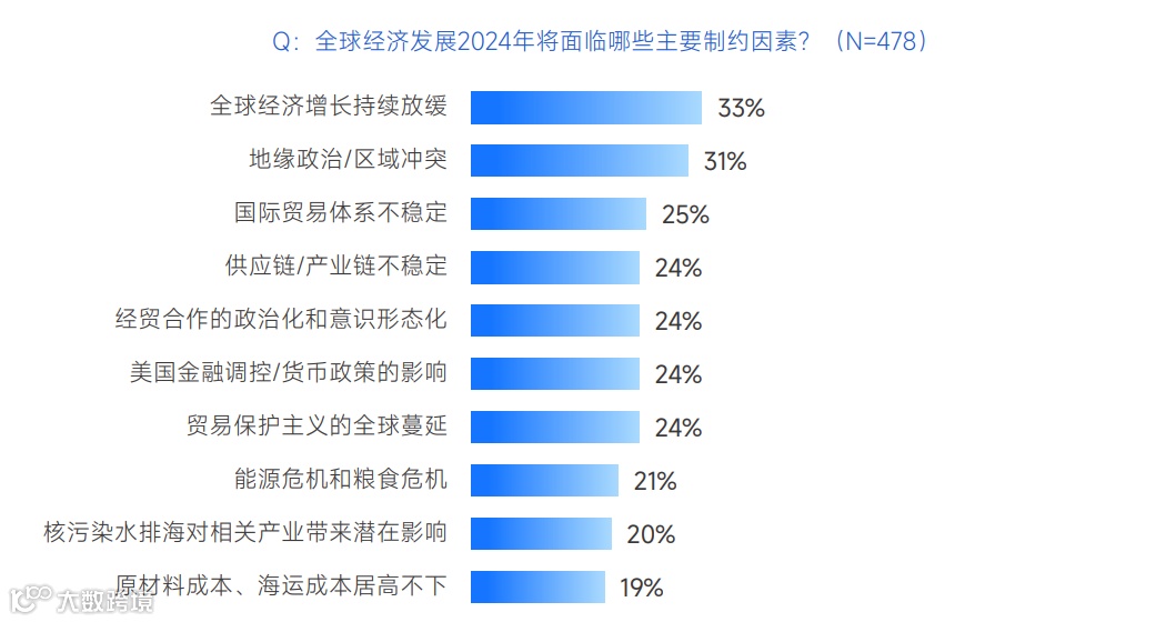 2024年全球经济发展面临的主要制约因素中,全球经济增长持续放缓最受关注,提及率近1/3,其次是地缘政治/区域冲突,提及率31%。此外,国际贸易体系不稳定、供应链/产业链不稳定、经贸合作的政治化和意识形态化、贸易保护主义的全球蔓延、美国金融调控/货币政策的影响等几大因素的提及率也均在1/4左右。