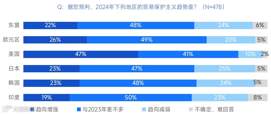 提及2024年的贸易保护主义走势,在列举的区域和国家中,认为美国的贸易保护主义将趋向增强的管理者占比达47%;其次是欧元区,认为其贸易保护主义趋向增强的比例为26%;日本和韩国的贸易保护主义将趋向增强的认同率均为23%。此外,认为美国贸易保护主义将减弱的认同率仅10%,远低于其他区域和国家的这一认同率。