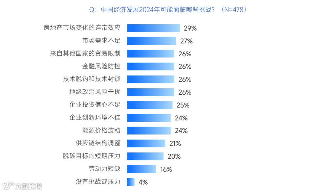 问及2024年中国经济可能面临的挑战,房地产市场变化的连带效应最受关注,提及率近三成(29%);其次是市场需求不足,提及率27%;其他国家的贸易限制、金融风险防控、技术脱钩和封锁、地缘政治风险干扰、企业投资信心不足等挑战的获选率也不低于1/4。