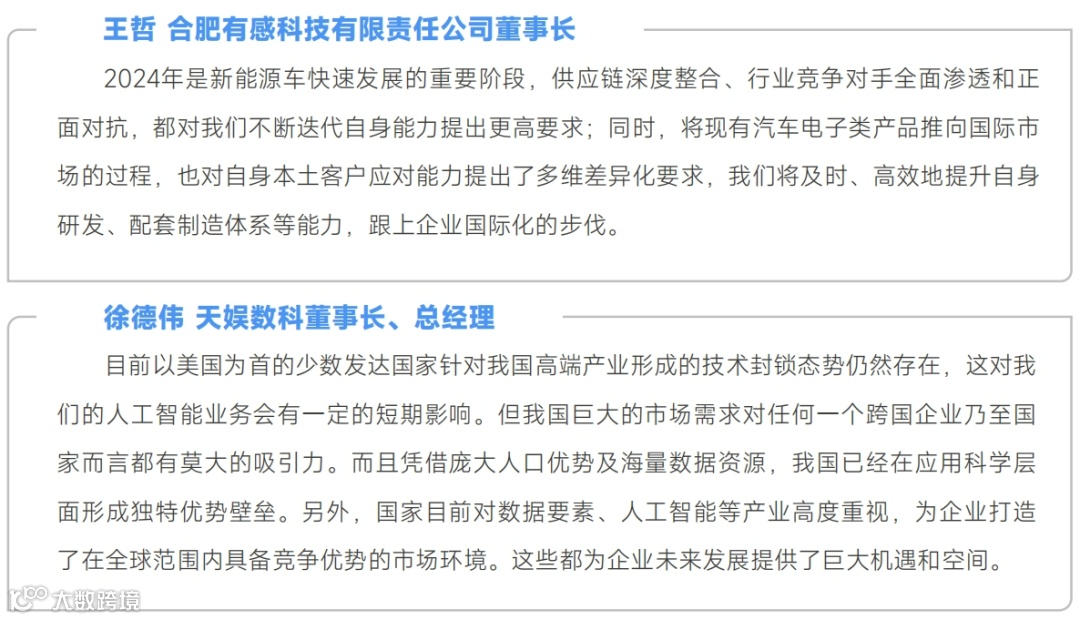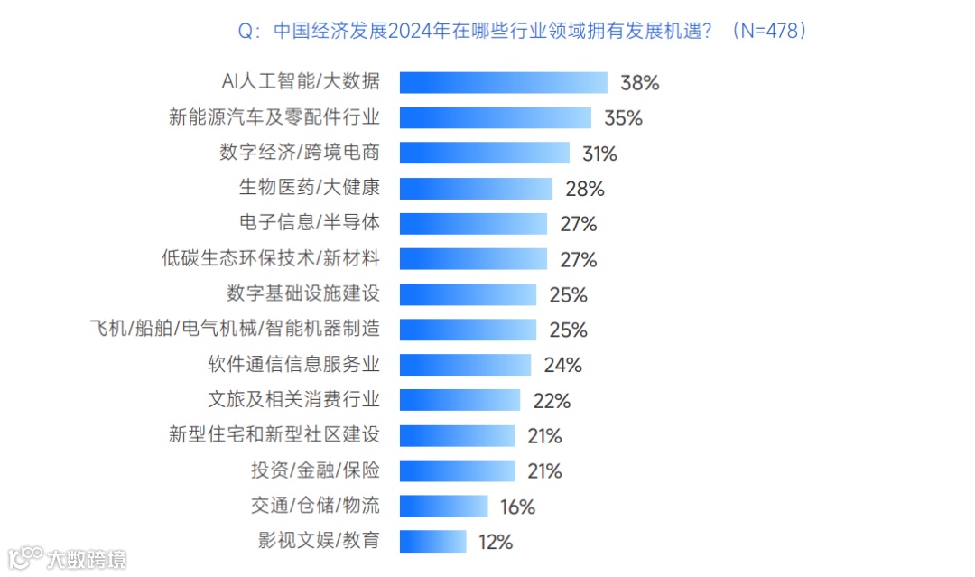 近四成企业管理者认为2024年中国经济在AI/大数据行业拥有发展机遇,还有35%认为是新能源汽车及零配件行业,数字经济/跨境电商行业的机遇也被三成企业管理者所认可。此外,生物医药、半导体及低碳技术/新材料相关行业的选择率也接近三成。