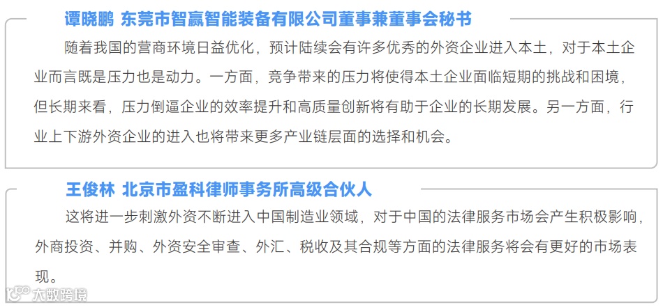 对于中国全面取消制造业领域的外资准入限制 ,有24%的受访者持明确的肯定态度,认为这对所在企业产生利好;超半数认为这对其企业有利好的可能。