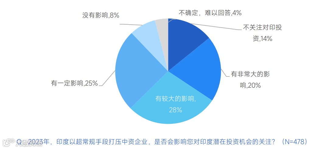 近3/4的企业管理者表示,会因为印度打压中资企业而影响其对印潜在投资机会的关注,其中20%表示影响非常大,近三成表示影响较大,25%表示有一定影响。