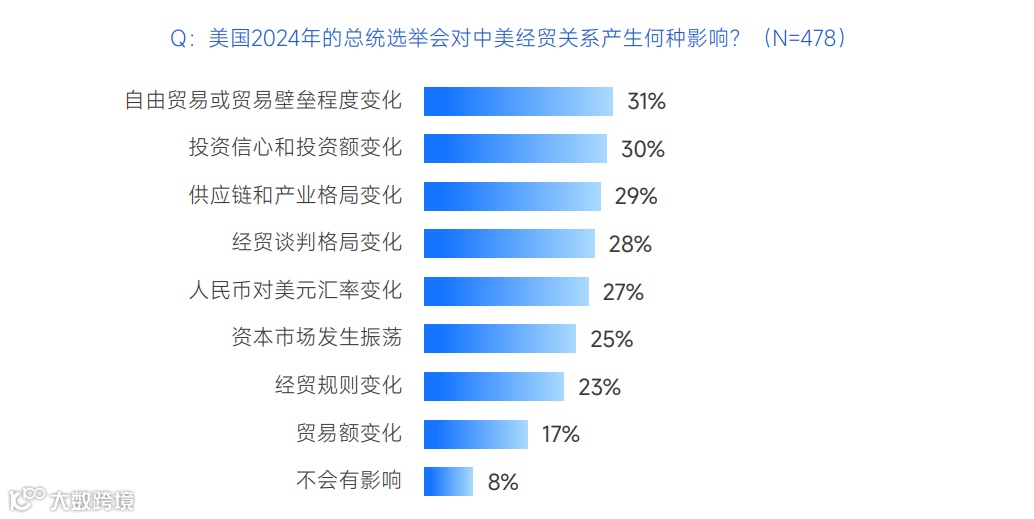 三成企业管理者认为2024年美国大选会使中美间自由贸易或贸易壁垒程度、投资信心和投资额发生变化;认为供应链和产业格局、经贸谈判格局、人民币对美元汇率会发生变化的比例也接近三成。