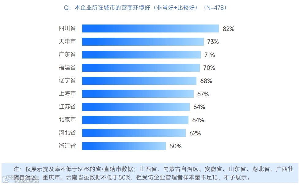 当邀请企业管理者对本企业所在省/直辖市的营商环境做出评价时,四川省获得当地企业管理者更多好评,超八成认为四川省营商环境好(包括“非常好”和“比较好”);天津、广东、福建、辽宁和上海的营商环境也获得七成左右企业管理者的好评;江苏、北京及河北的好评率超六成;浙江为50%。
