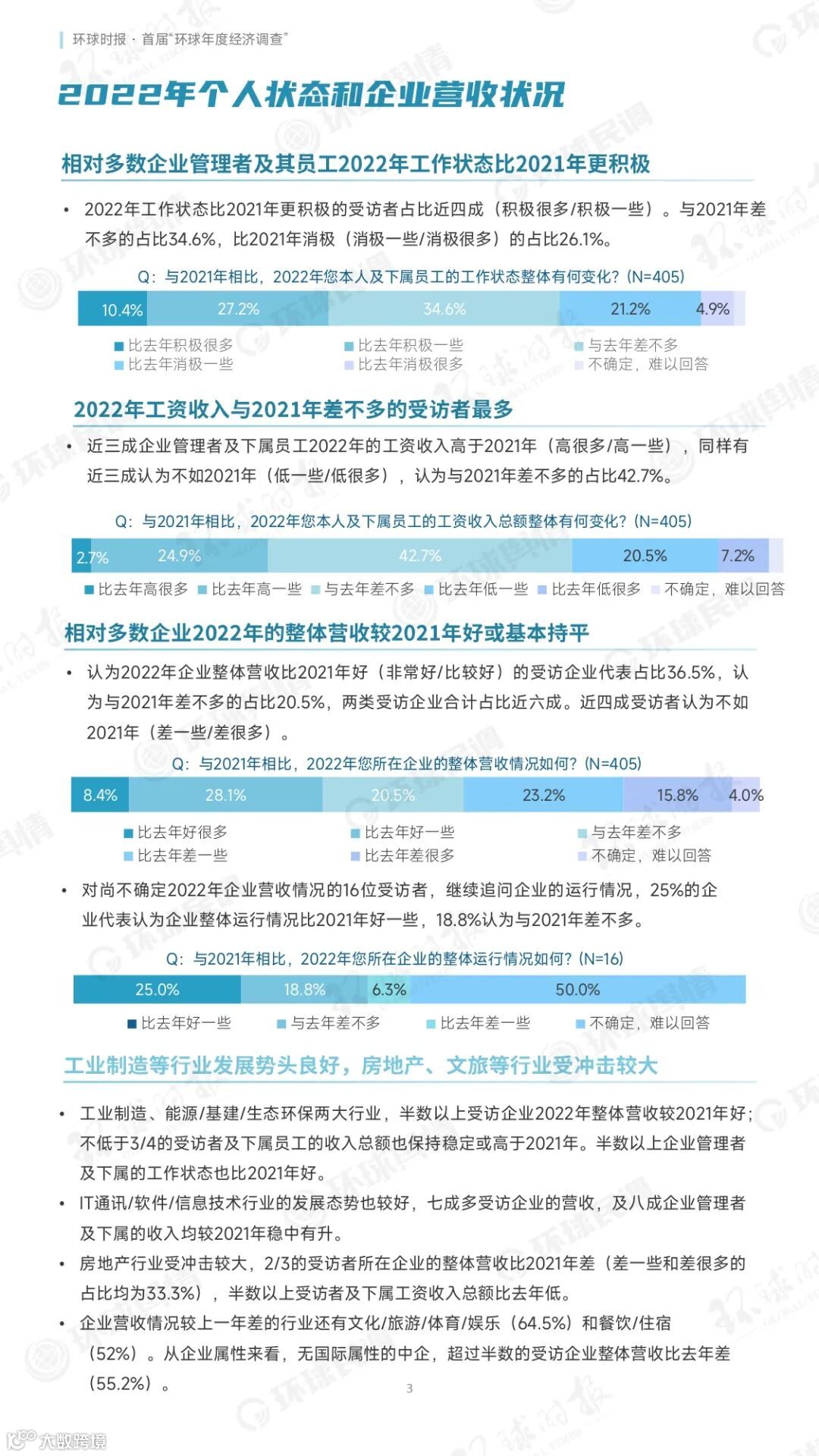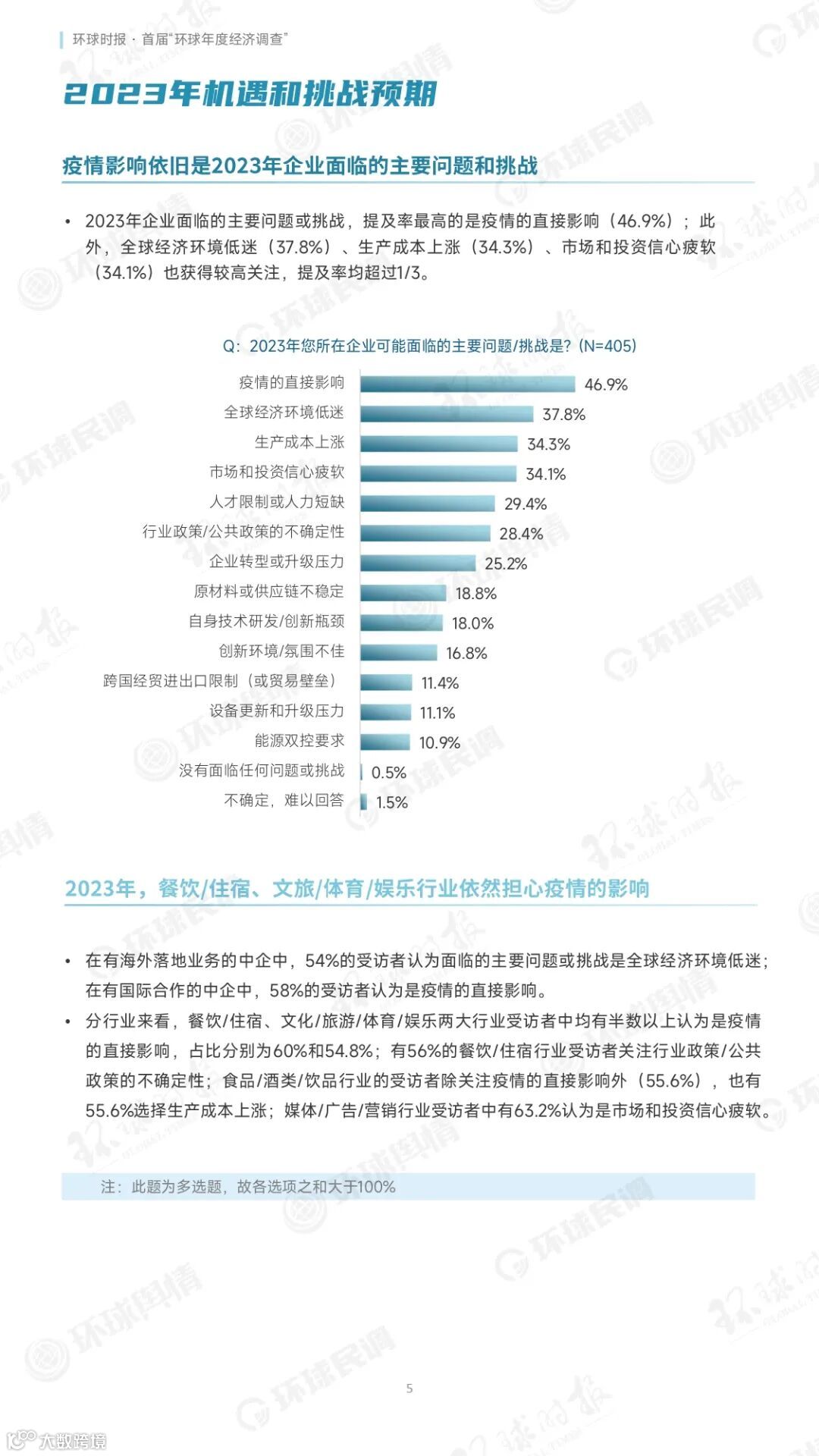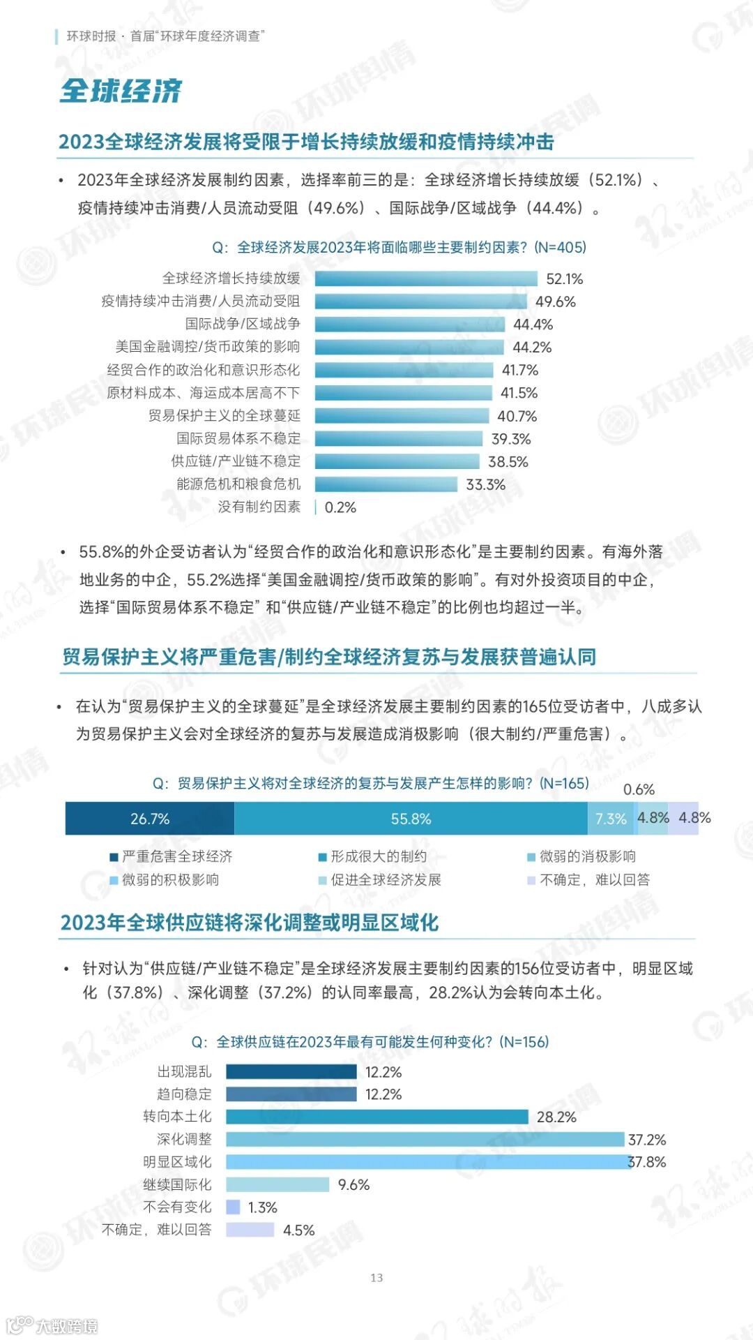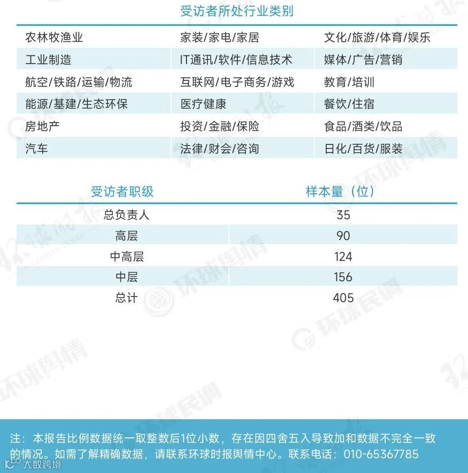 展望未来,胸怀使命,心有所信,方能行远。环球时报舆情中心联合环球时报采编中心,在岁末年初面向中外在华企业中高层发起主题为《经济预期、发展预测与趋势预判》的首届“环球年度经济调查”,倾听18个主要行业大类的405位中外企业中高层对中国和世界经济的见解和看法,汇聚开创未来的强大共识,携手向前,为2023年中国乃至世界经济的发展贡献智慧和力量。