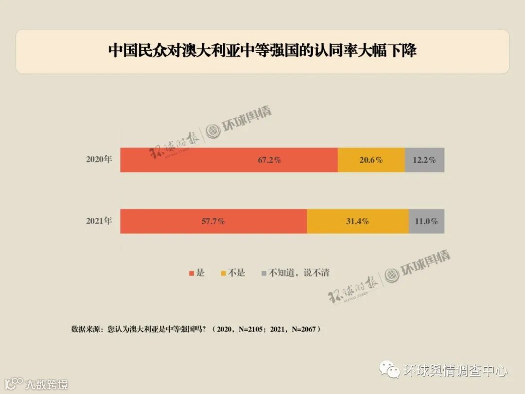 本次调查采用了基于大规模会员样本库的在线问卷调查方法,在6月11日至6月15日进行,共回收有效问卷2067份,覆盖北京、上海、广州、西安、沈阳、武汉、成都、郑州、青岛、昆明10个城市。调查结果参考中国互联网信息中心(CNNIC)2021年2月3日发布的第47次《中国互联网络发展状况统计报告》中的网民年龄、性别结构进行加权处理。调查发现,2021年受访者对澳大利亚的好感度同比下降近10分,降至55.6分,受访者对澳大利亚中等强国的认同率也下降至57.7%。