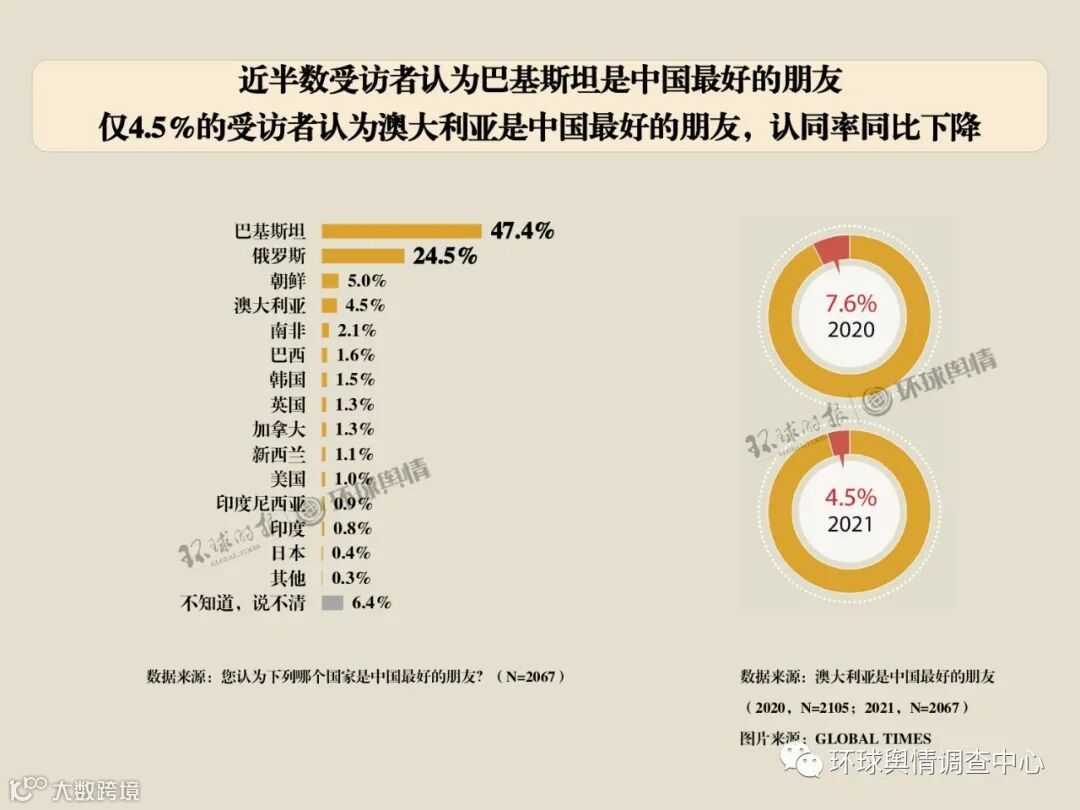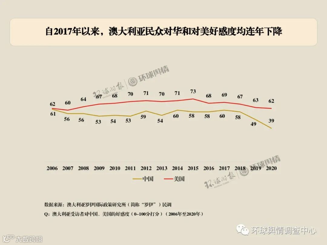 本调查为《环球时报》旗下舆情调查中心(“环球舆情”)与北京外国语大学澳大利亚研究中心(“北外澳研”)合作开展的专门针对中澳关系的年度公众调查,今年为第二年。本次问卷调查的执行方为数字100市场调研公司。澳方数据来源于澳大利亚Lowy Institute(罗伊国际政策研究所)民调。