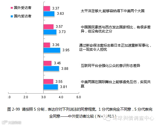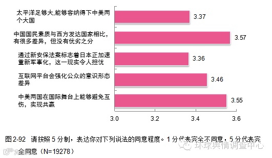 针对受访者问及如何看待中美关系未来走向、中国国民素质、日本新安保法案通过等热点话题,19国调查显示,国外受访者最认可“中国国民素质与西方发达国家相比,有很多差异,但没有优劣之分”的评述,在5分制的打分中给出了3.57分的最高分数。另外,国外受访者还对“中美两国在国际舞台上能够避免互伤,实现共赢”打出了3.55以上的分数,属于“中立”与“比较同意”之间水平。“互联网平台会强化公众的意识形态差异”和“太平洋足够大,能够容纳得下中美两个大国”,分别给出了3.46分和3.37分。国外受访者认同度最低的热点话题评述是“通过新安保法案标志着日本正加速重新军事化,这一现实令人担忧”,但也给出了3.36分。