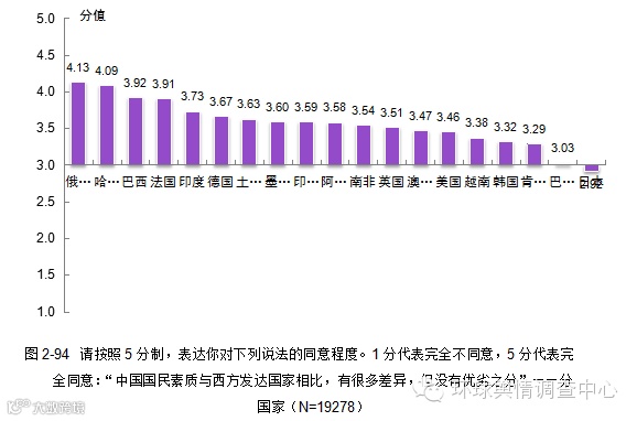 针对“中国国民素质与西方发达国家相比,有很多差异,但没有优劣之分”表述,俄罗斯与哈萨克斯坦受访者的认同度排名一二位,属于“比较认同水平”,其余的国家受访者分数由大到小排名依次为巴西、法国、印度、德国、土耳其、墨西哥、印度尼西亚、阿根廷、南非、英国、澳大利亚、美国、越南、韩国、肯尼亚、巴基斯坦、日本。
