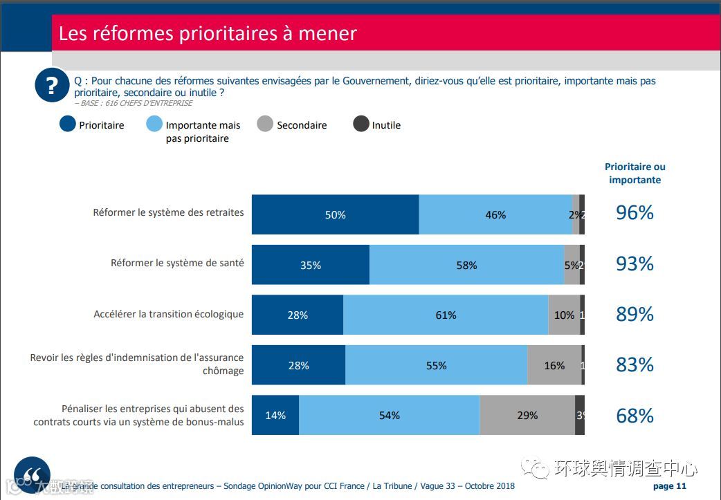 当问及“以下政府改革措施中,您认为应优先处理哪一项”时,50%的法国受访者认为是“养老金制度改革”,比例最高,其次分别为“卫生系统改革”(35%)、“生态转型”(28%)、“失业保险规则修订”(28%)、“设立对滥用短期合同的雇主的惩罚机制”(14%)。