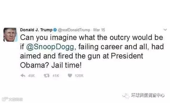 在特朗普就职两个月之后,身陷各种争议的他发了一条推特,公然手撕美国西岸老牌说唱歌手Snoop Dogg。在这条推特里他说:“如果Snoop Dogg,先不说过气成什么样,拿枪瞄准的是奥巴马总统,你能想象那会引起多大骚乱吗?后果当然是坐牢!”
