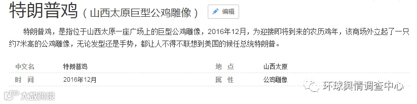 这只原产地我国山西太原的鸡,是北京一家商务公司为该商场设计的。这个雕塑设计采用了美国西雅图插画师和动画设计师凯西·拉蒂奥莱斯(Casey Latiolais)的方案,有着无与伦比的迷之美感和浓厚的后现代主义风格。设计师表示,成品出来之后大家纷纷把它和特朗普联系起来,纯粹是一个巧合。