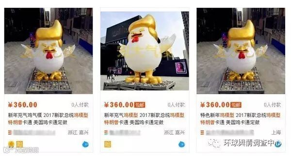 这只充气的特朗普公鸡现已成为中国互联网购物门户网站上的热销货。有各种大小和设计图案飞充气特朗普公鸡。例如180厘米高的特朗普鸡售价折合大约47欧元(约合人民币345元),超大号的价码高达5000多欧元(约合人民币3.6万),有16米高。当然,便宜的也有。