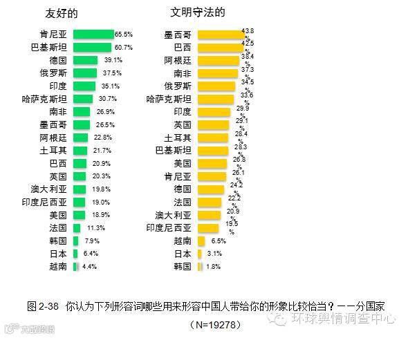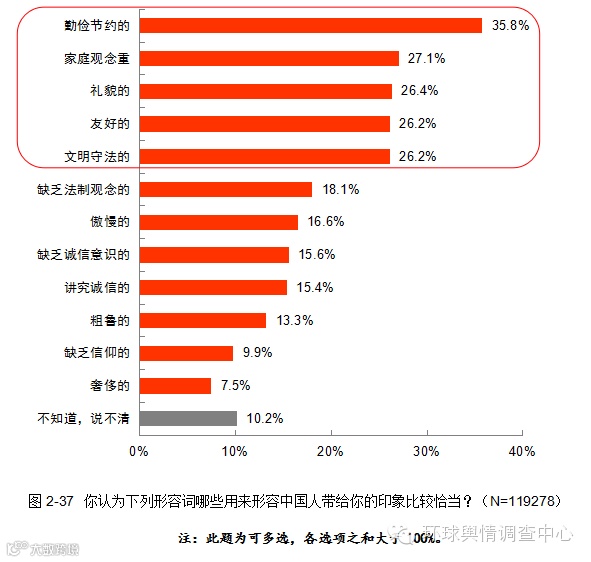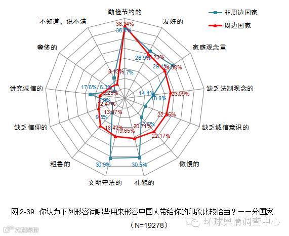 周边国家更加认可中国人“勤俭节约”的好形象,而突出地批评了中国人“缺乏法制观念”、“缺乏信仰”、“傲慢”、“粗鲁”、“缺乏诚信”、“奢侈”的不良特质;非周边国家更加认可中国人“友好”、“家庭观念重”、“礼貌”、“文明守法”、“讲究诚信”的良好特质。