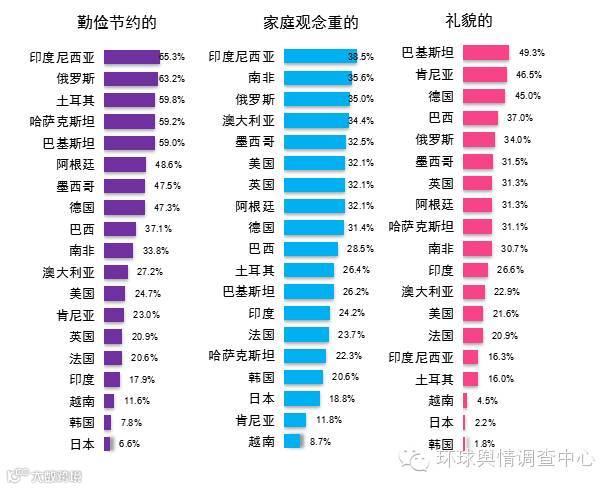 对于中国人的“勤俭节约”,认知率最高的是印度尼西亚受访者,达65.3%,其次为俄罗斯(63.2%)、土耳其(59.8%)、哈萨克斯坦(59.2%)、巴基斯坦(59.0%);对中国人有较好的“家庭观念重的”印象的受访者国家有印度尼西亚、南非、俄罗斯、澳大利亚、墨西哥、美国、英国、阿根廷和德国;巴基斯坦、肯尼亚、德国的受访者与其他国家受访者相比更加认可中国人“礼貌的”形象,越南、日本、韩国受访者对此的认可度最低;对中国人“友好”的认知率的为肯尼亚和巴基斯坦受访者,也显著高于其他国家受访者,分别达65.5%和60.7%。墨西哥和巴西受访者最认可中国人“文明守法”的形象,而越南、日本与韩国受访者对中国人“文明守法”的认知率显著低于其他国家。此外,就“缺乏法制观念”一项,韩国和日本有五成以上的受访者持此观点,越南亦有三成受访者的持此观点。