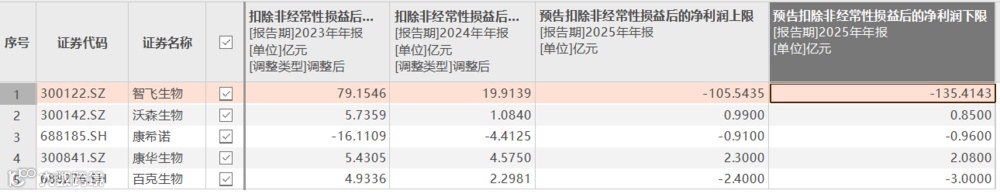 1)智飞生物:曾有”疫苗一哥“之称的智飞生物,在核心代理产品HPV疫苗供需恶化,陷入价格战;以及被市场看做公司“第二增长曲线”的代理产品疱疹疫苗,销售不及预期的情况下,业绩受到扰动较大;再加上存货较多,库存消化困难,计提大额存货减值准备的情况下,2025年首次年度亏损,预亏超百亿。
