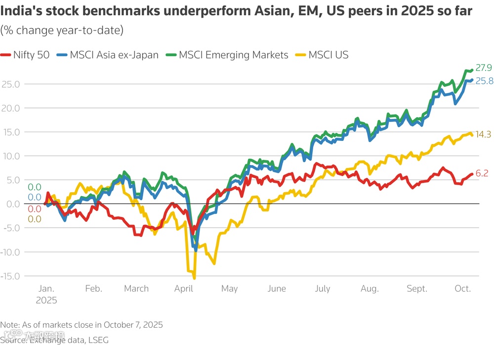 2025年以来,卢比兑美元已贬值近5%,这还是在同期美元指数下跌超过7%的基础上。这意味着,如果盈利10%,但卢比贬值7%,从美元视角看,风险收益比可能还不如美债。