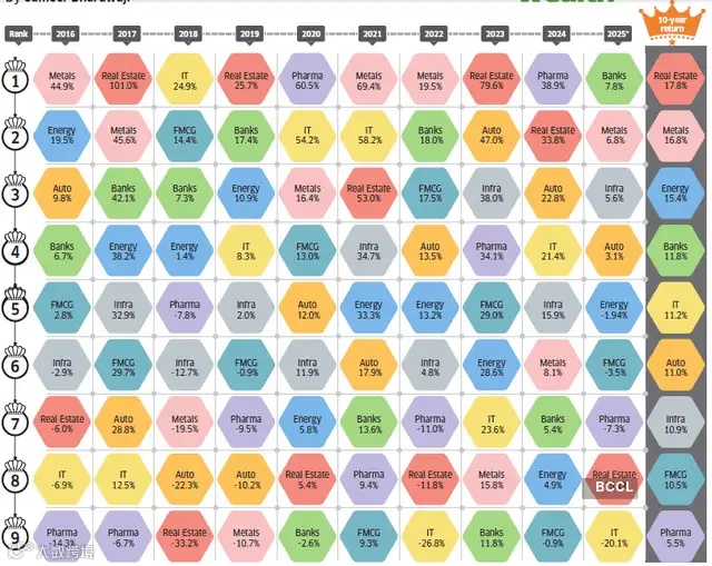 2025年,印度国家银行(SBI)股价已上涨近25%,在Nifty指数中超越了所有主要的私营银行同行;而银行板块和IT板块正好在今年涨幅榜的一首一尾,遥望呼应。