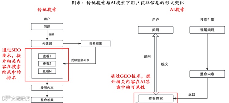 相关的新模式是GEO(生成引擎优化)。简单来讲,就是用户向AI提需求,经过GEO优化的品牌会被AI直接纳入答案,卖点介绍、购买均可在同一页面完成。而传统SEO(搜索引擎优化)需要用户用关键词检索,然后在一众跳出的链接中逐一查看。