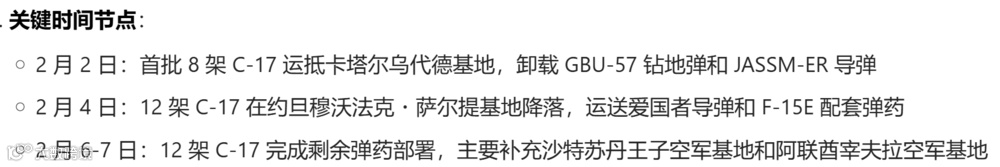 最近一周(2026.2.1-2.8)美军向伊朗周边完成1000 吨级精确制导弹药与防空装备的补充部署,主要通过C-17 重型运输机空运至卡塔尔、约旦、沙特等前沿基地,与 “林肯” 号航母打击群的450 枚战斧导弹形成 “空中 + 海上” 双重打击体系,为可能的多波次空袭提供弹药保障。