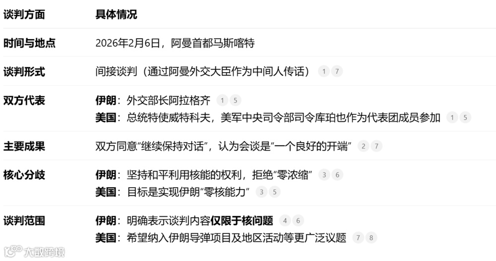 2026年2月6日,伊朗和美国在阿曼首都马斯喀特举行了自2025年6月谈判中断以来的首次核问题谈判。这次谈判成功地重启了中断已久的外交渠道,避免了局势立即升级,这是其最积极的成果。