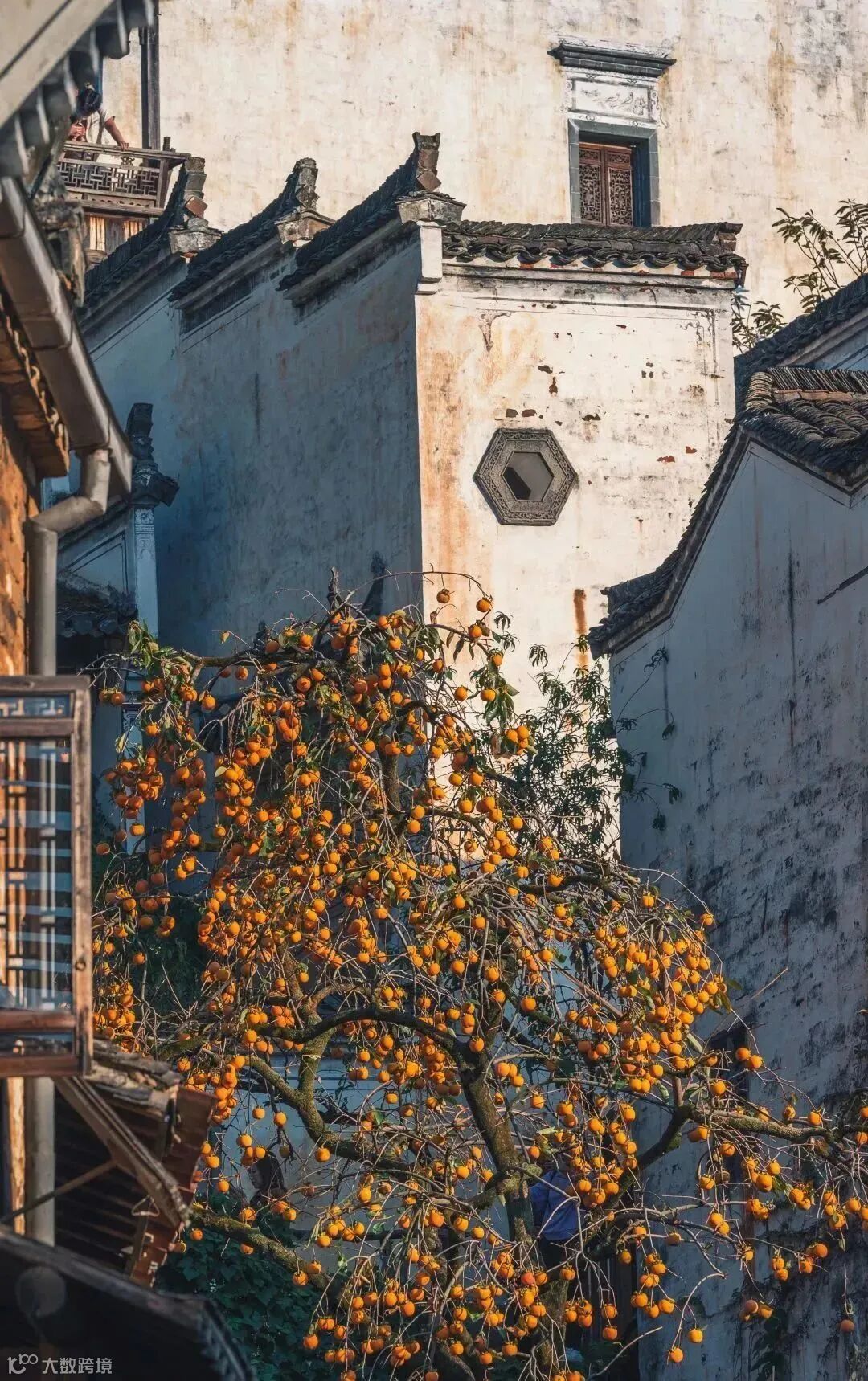 在山村中,一棵硕果累累的柿子树在建筑前,利用长焦焦段拍摄,规避了下方的行人和招牌,把徽派建筑的设计感与代表美好象征的柿子树同时拍摄下来,凭借光与影形成的空间感,形成了颇具寓意的画面。