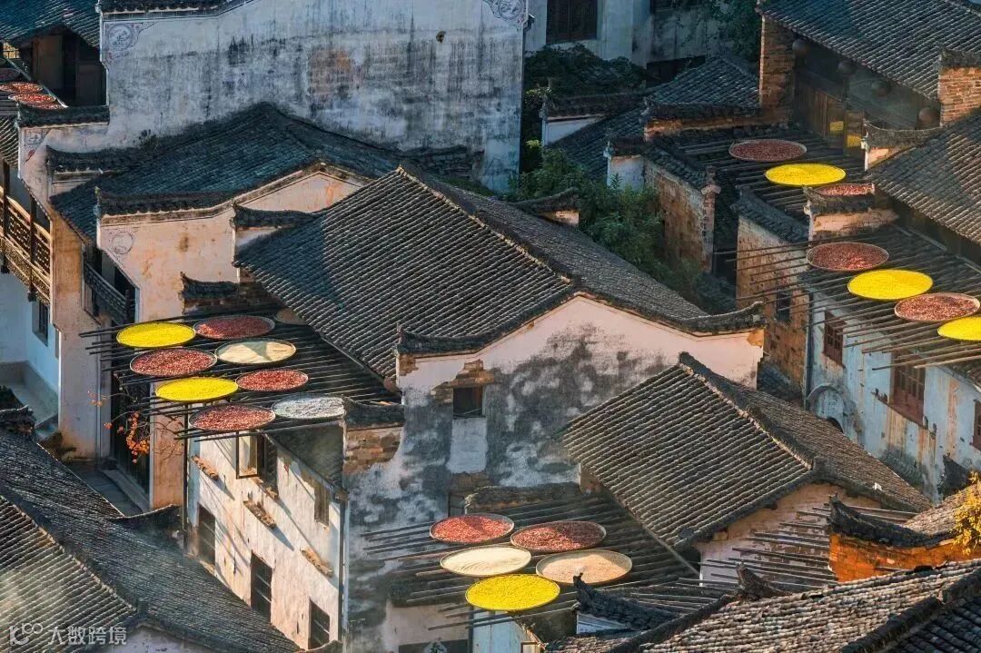 同样的位置,利用竖构图由近及远,把前后的建筑都拍摄到画面中,近处前景是屋檐下晾晒的作物,远处是层层徽派建筑,画面从近到远都记录下了建筑的丰富细节和晒秋的各种色彩。