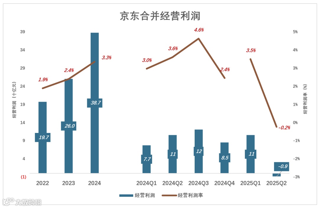 2024年Q2,京东合并经营利润105亿,2025年Q2合并经营亏损近9亿。