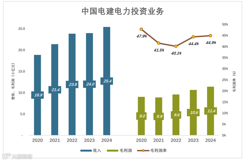 2024年,电力投资收入254亿、毛利润114亿,毛利润率达45%。未来几年,随着新项目投运(已建/在建项目装机47.2GW),电力投资收入将大幅增长。