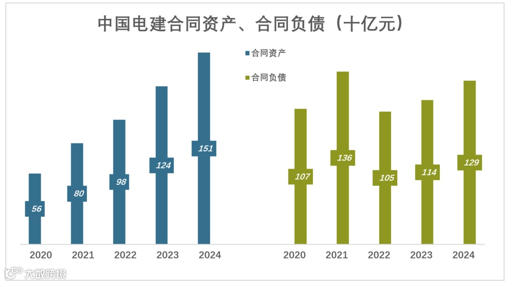 2020年末,电建合同负债高达1070亿,合同资产只有560亿;预收大于履约后末收;