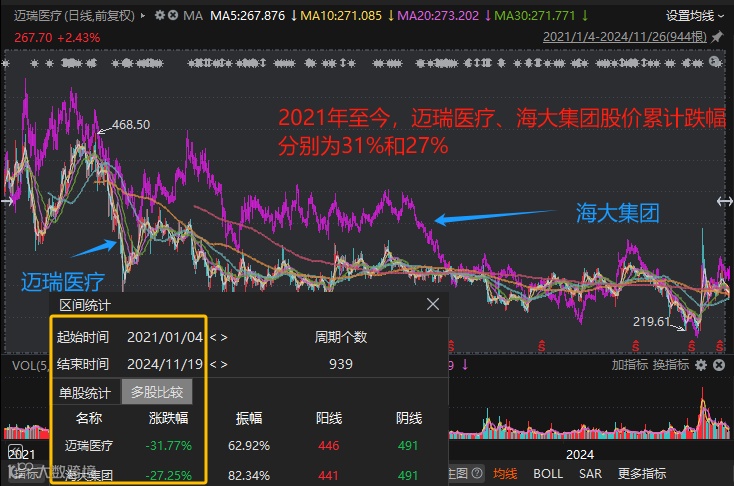 至于前期拓展并在2020年Q3、Q4起分别重仓至今的医疗器械迈瑞医疗、畜牧养殖龙头海大集团,这几年股价不断走弱情况下,刘彦春也未有太多减持,类似消费持仓,也是“硬扛”到现在,对基金净值带来拖累。这也说明其对非消费行业的趋势变化把握能力不足。
