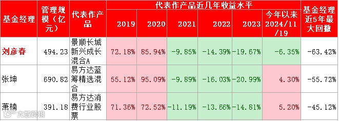 典型如张坤代表作易方达蓝筹精选基金今年以来业绩回报+4.3%,萧楠的代表作易方达消费行业股票基金作为消费主题基金,实现+5.2%的业绩回报,远超刘彦春在管基金均为负回报表现。