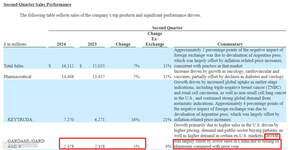 公司在之后的电话会议中详细介绍了HPV疫苗的销售情况:中国是默沙东HPV疫苗的主要销售市场,在中国的销售额大概要占到全球销售额的60%至70%。2024年第二季度,公司在中国以外的“所有地区”都实现了两位数的增长,但中国区的销售增长不及预期,抵消了其余部分地区的销售额增长。