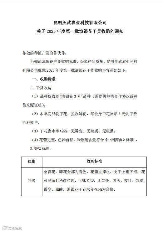 昆明英武农业科技有限公司诚邀广大滇银花种植户及合作伙伴,共同遵守收购标准,提升滇银花品质。让我们携手并进,共谋发展,共创滇银花产业新篇章!